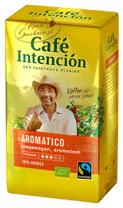 Kawa Cafe Intencion jest wytworzona w zgodzie z zasadą Fair Trade – wspierającą małych producentów, na rodzinnych plantacjach, dla których kawa jest podstawą istnienia. Symbol Sprawiedliwego Handlu daje gwarancję uczciwego traktowania jej wytwórców. Długo palone ziarna dają intensywny aromat i gęstą, orzechową cremę. Certyfikat EKO daje pewność, że użyte w tej mieszance ziarna kawy powstały pod pełną kontrolą, z użyciem najwyższych standardów wypracowanych dla rolnictwa ekologicznego.