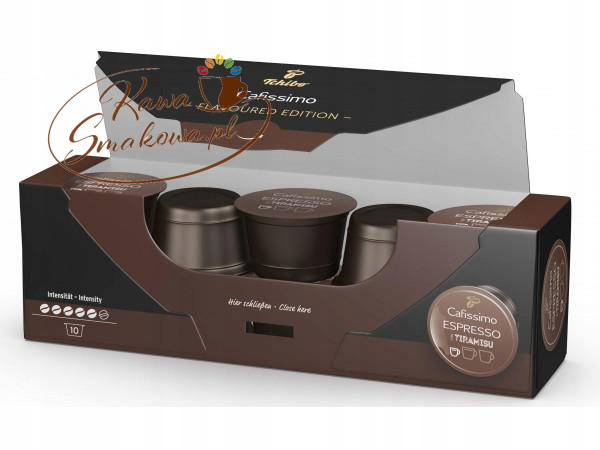 Kawa ukryta w tych kapsułkach to blend czyli mieszanka ziaren gatunków arabika i robusta, które pochodzą tylko z certyfikowanych upraw. Posiada piękną, złotą cremę i głęboki, bogaty smak. Tchibo Cafissimo Espresso Tiramisu to limitowana edycja i niesamowite połączenie espresso z nutą słodkiego kawowego ciasta Tiramisu znanego zapewne wszystkim kawoszom i podbijającego podniebienia miłośników ciast. Intensywne cynamonowe nuty będą świetną odskocznią od codziennego zwykłego espresso szczególnie zimą. Ta kawa rewelacyjnie sprawdzi się w połączeniu z mlekiem jako cappuccino lub latte. Jej intensywność wynosi 5 w 6 stopniowej skali.